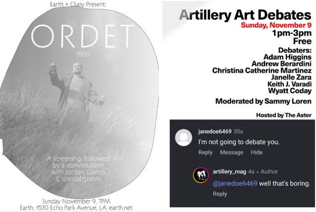 LOS ANGELES - From 1pm at The Aster — Artillery Art Debates will get heated over topics including “Should we bring back gatekeeping” and “Does art have to look good?” Moderated by Sammy Loren.