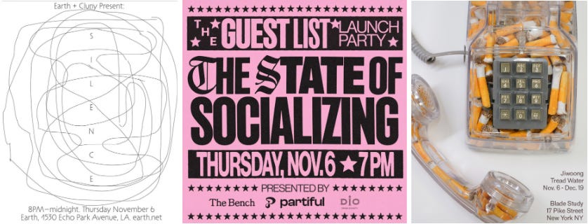 From 7pm - 10pm at The Bench — Partiful is throwing a party to celebrate the inaugural launch of new blog ‘The Guest List.” On principle, I’m opposed to brand-hosted-parties, but this one does admittedly look fun. - “the citizens of New York are hereby called to assemble and address urgent matters of social life.” Opening remarks from Matt Starr and Halle Robbe. Partiful Town Hall dresscode.