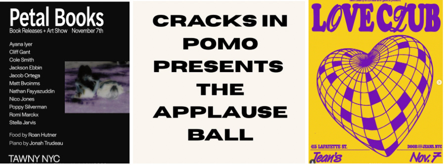 From 7pm - 11pm at Tawny — Petal Books hosts a book release and art show, ft Ayana Iyer, Ciff Gant, Cole Smith, Jackson Ebbin, Jacob Ortega, Matt Bvoinms, Nathan Fayyazuddin, Nico Jones, Poppy Silvermen, Romi Marckx, Stella Jarvis. Food by Roan Hutner. Piano by Jonah Trudeau.