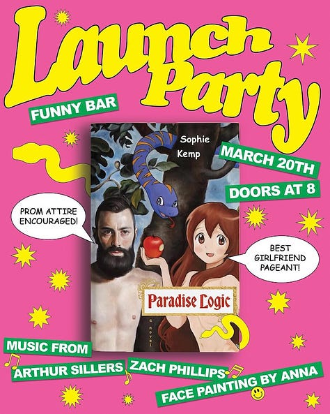 From 6pm at Funny Bar — Sophie Kemp and Forever Mag celebrates the launch of Kemp’s Paradise Logic. Music from Arthur Sillers and Zach Phillips. Prom attire encouraged.