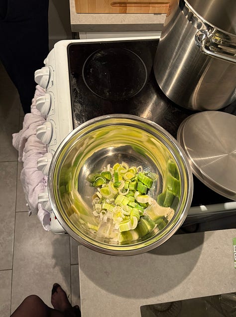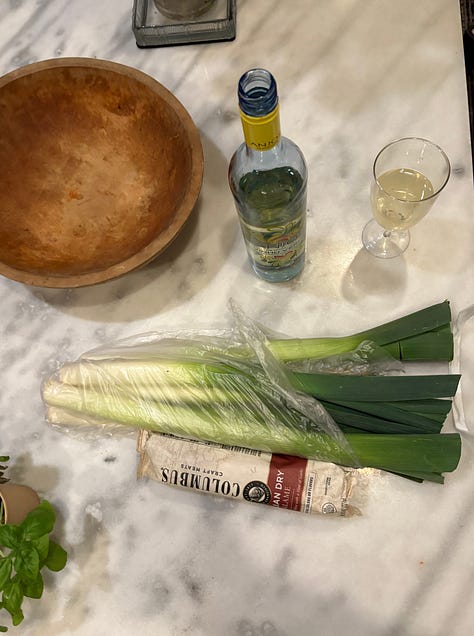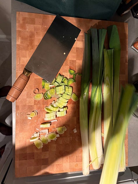 David is going to make a brilliant green extract, he tells me. This is not for tonight (tonight is potato leek soup) but this is for later. This is for when he makes the halibut and the fingerling potatoes