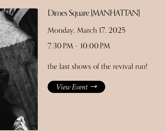From 7:30pm - 10pm at Artx — Dimes Square is closing forever! But first, it’s coming back through March 22. If you haven’t seen this production yet, you should! You can read My Dimes Square Think Piece here.