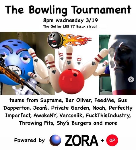 From 8pm at The Gutter LES — Zora & Nolita Dirtbag are hosting a bowling tournament. Teams from Supreme, Bar Oliver, FeedMe, Perfectly Imperfect, Throwing Fits, and more. Must download the Zora app and show profile for entry.