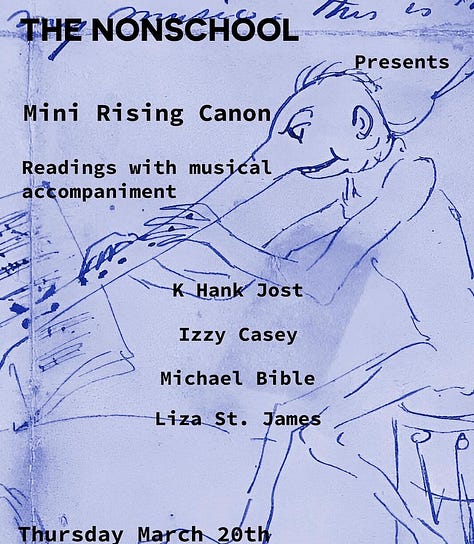 From 8pm at 8 St. Marks — The NonSchool hosts an evening of readings with musical accompaniment. Ft. K Hank Jost, Izzy Casey, Michael Bible, and Liza St. James.