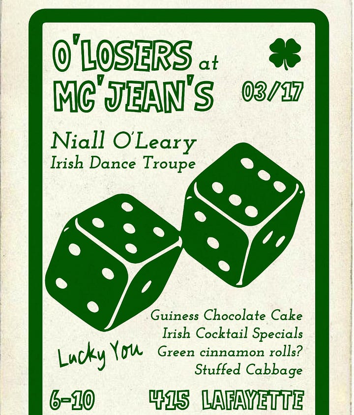 From 6pm - 10pm at Jean’s — Loser’s returns, with guinness chocolate cake, irish cocktail specials, green cinnamon rolls, and stuffed cabbage. You better wear green!!!