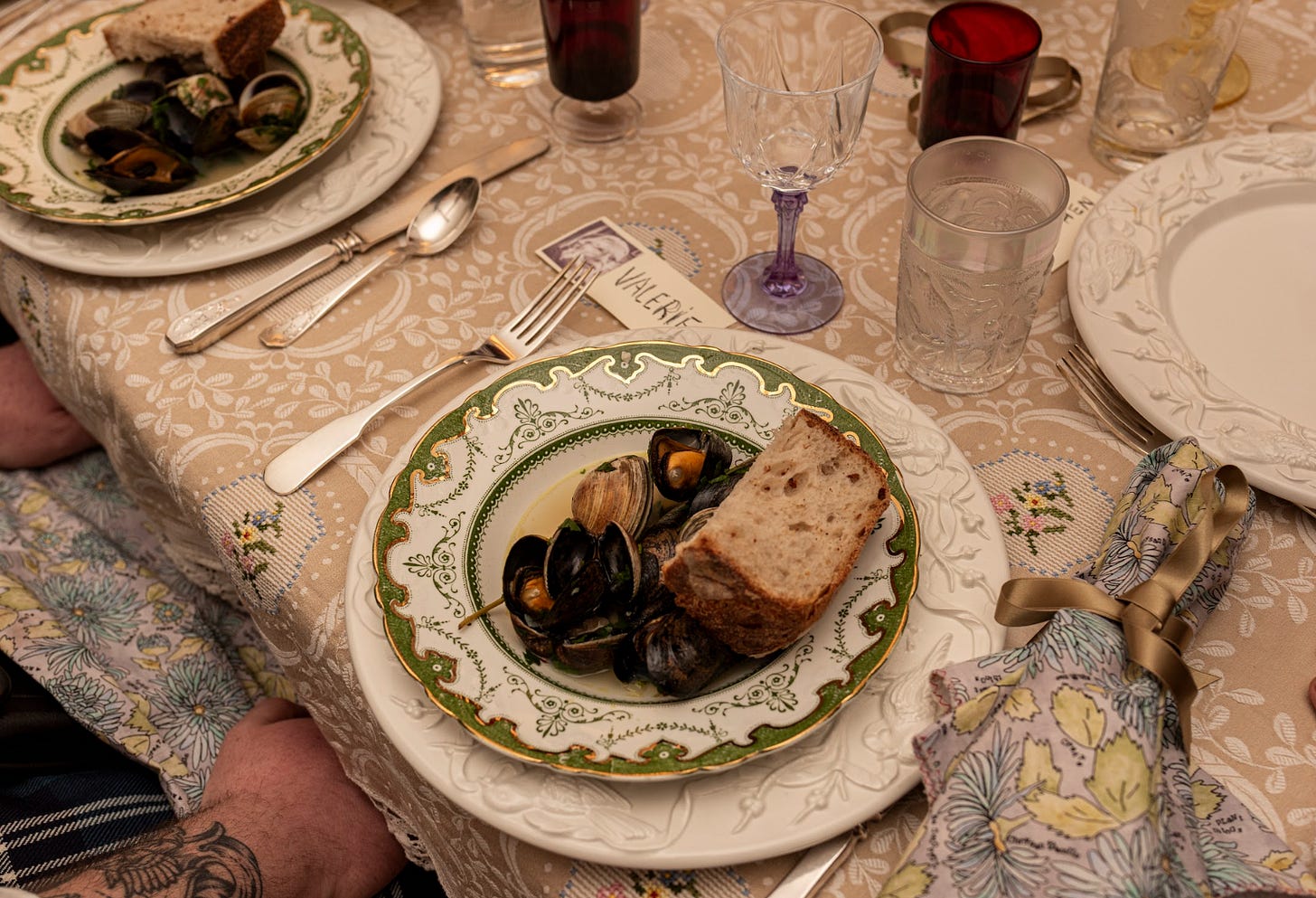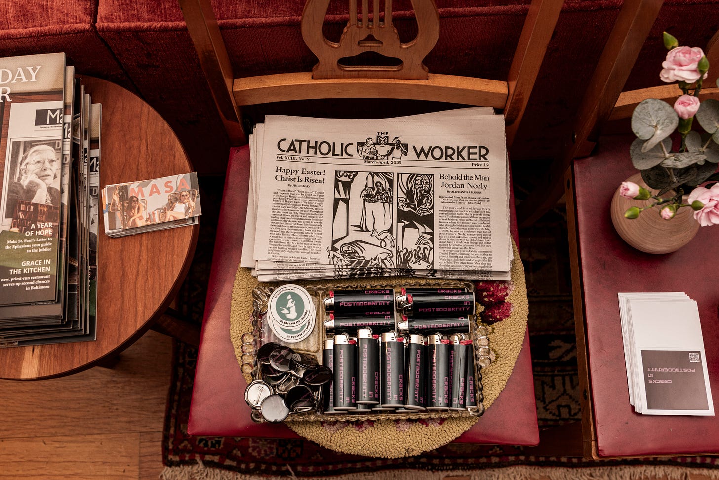 At dinner last night, there were little mussels and clams with homemade bread, tomato soup and baked potatoes, homemade cinnamon rolls, dandelion wine or, I think it was dandelion at least. This was a menu inspired by Dorothy Day and when Dorothy Day made wine in her Staten Island cottage in 1924 it was brewed from dandelion. The wine is from The Hudson Valley, here. The bathroom is wallpapered in copies of The Catholic Worker Newspaper.