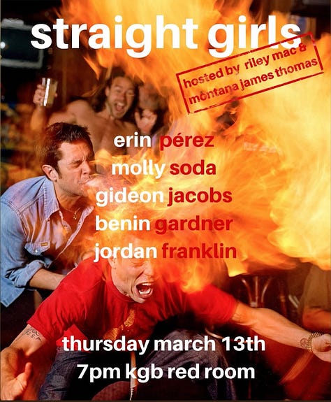 From 7pm at KGB Red Room — Riley Mac and Montana James Thomas present the latest installment of Straight Girls, ft readings by Erin Pérez, Molly Soda, Gideon Jacobs, Benin Gardner, and Jordan Franklin.