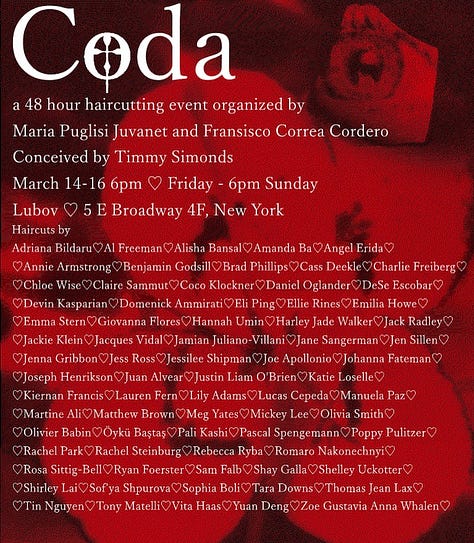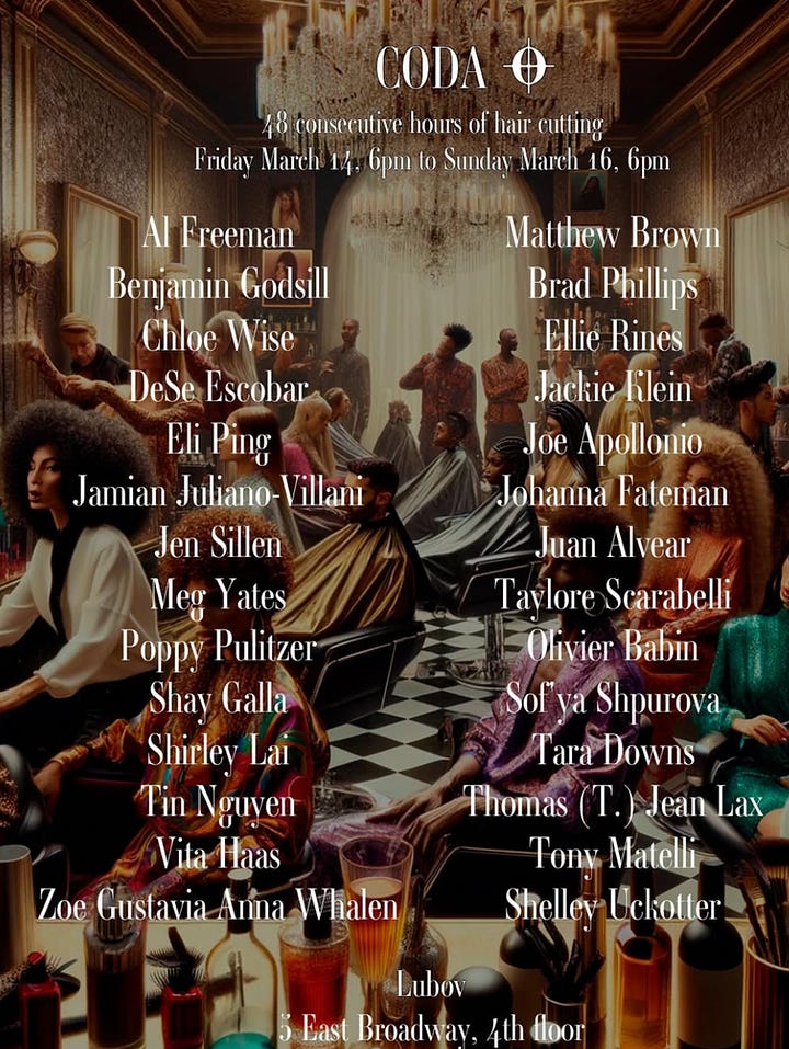 From 6pm at Lubov — A 48 hour haircutting event begins. Haircuts offered by over 70 artists, gallerists, designers, musicians (none of them, as far as I know, stylists by trade, so attend at your own risk) - including Annie Armstrong, Emma Stern, Jamian Julian-Villani, Vita Hass, Sam Falb, and more. Organized by Masha Gaze and Timmy Simonds. Music by Gabriel Hollis, Marika Thunder, and more. Readings by Nick Dove, Sierra Armor, Tess Manhattan, and more. A Club Chess popup, screenings, cigarettes, quests (?). There’s too many people involved to list them all, but you have a full weekend to attend and see what you discover for yourself.