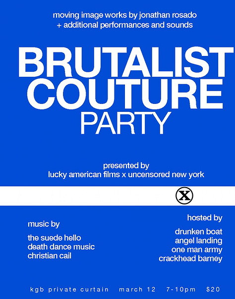 From 7pm - 10pm at KGB — Lucky American Films x Uncensored New York presents a Brutalist Couture Party - “a crossroads of the New York underground everything.” Music by The Suede Hello, Death Dance Music, and Christian Cail. Hosted by Drunken Boat, Angel Landing, One Man Army, and Crackhead Barney.