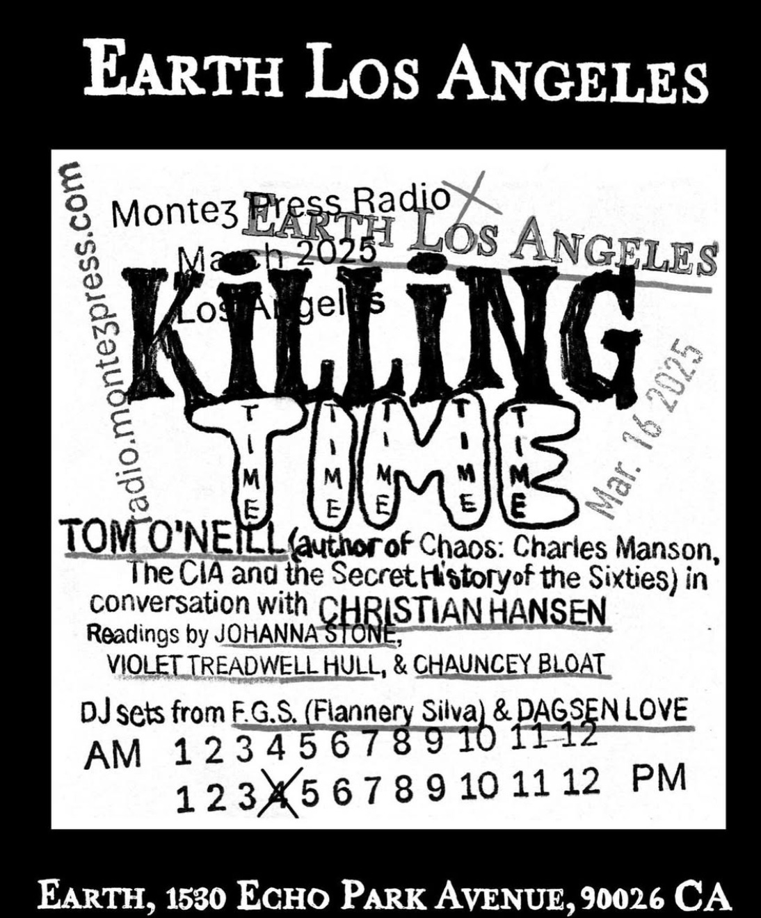 At Earth Los Angeles from 4pm - 8pm — Montez Press Radio & Earth present the first in a series of collaborative shows in Los Angeles. KILLING TIME features author Tom O’Neill and investigative journalist Christian Hansen in conversation about American murder cults. Readings and DJ sets to follow. Attend in person, listen on https://radio.montezpress.com/#/, orlivestream on Earth’s Youtube.