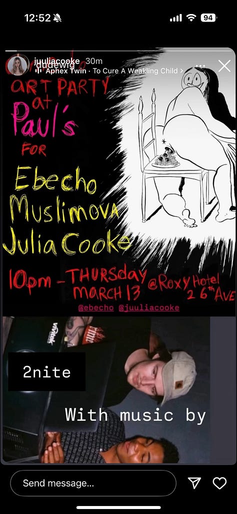 From 10pm - late at Roxy Hotel (2 6th Ave) — Ebecho, Muslimoa, and Julia Cooke host Art Party at Paul’s.