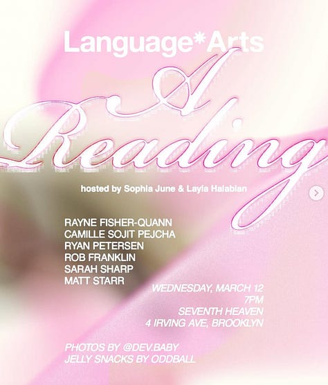 From 7pm at Seventh Heaven — Language Arts (friend of the letter) is hosting their first reading. Language Arts is a substack by Sophia June and Layla Halabian about “books you actually want to read.” Readings tonight by Rayne Fisher-Quann, Camille Sojit Pejcha, Ryan Peterson, Rob Franklin, Sarah Sharp, and Matt Star. Photos, jelly snacks, karaoke all night after the event. | RSVP here