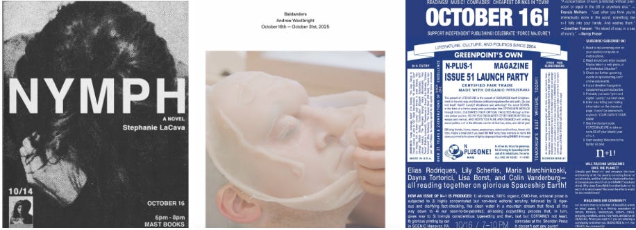 From 7pm - 10pm at 37 Greenpoint Ave #316 — N+1 celebrates ISSUE #51: FORCE MAJEURE with readings and drinks. Ft Elias Rodriques, Lily Scherlis, Maria Marchinkoski, Dayna Tortoric, Lisa Borst, and Colin Vanderburg. RSVP here