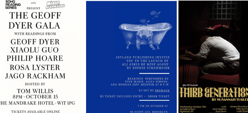 LONDON - From 8pm at The Mandrake Hotel — Soho Reading Series and Minor Attractions present The Geoff Dyer Gala. Readings from Geoff Dyer, Xiaolu Guo, Philip Hoare, Rosa Lyster, and Jago Rackham. Hosted by Tom Willis. | RSVP here.