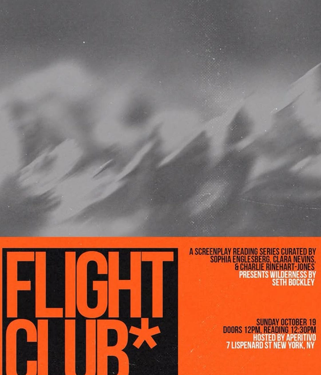 From 12:30pm at 7 Lispenard St — Sophia Englesberg, Clara Nevins, and Charlie Rinehart-Jones present Fight Club III - a reading series for new screenplays. Sunday’s reading is WILDERNESS by Seth Bockley. | tickets here.