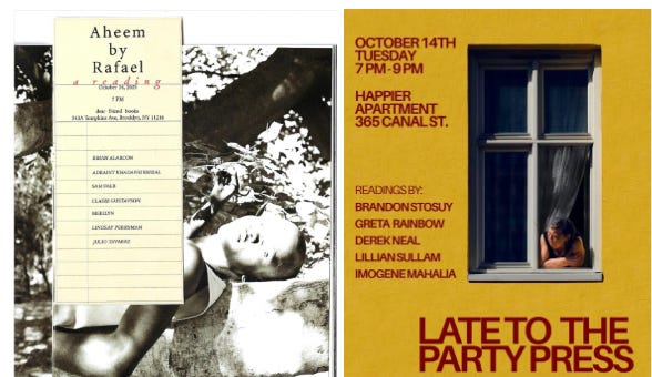From 7pm - 9pm at 365 Apartment (above Happier Grocer) — Late To The Party Press presents a reading ft Brandon Stosuy, Greta Rainbow, Derek Neal, Lillian Sullam, and Imogene Mahalia.